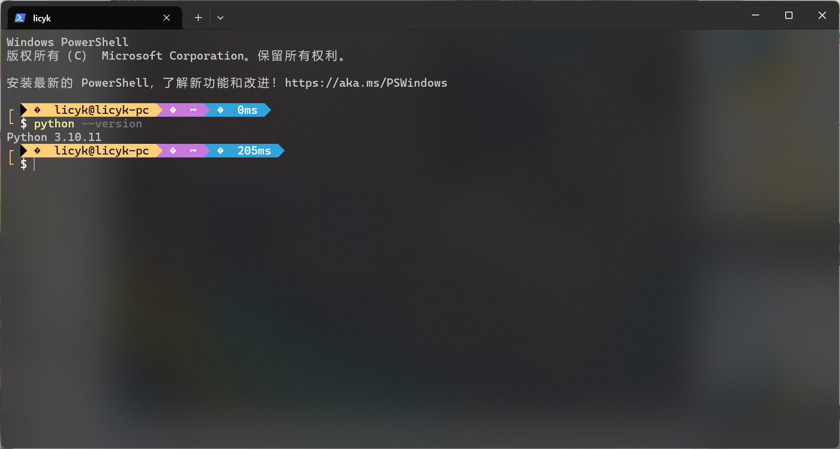 安装完成后右键桌面或者文件管理器空白处,在右键菜单选择在终端打开,此时将启动 PowerShell(默认情况下),在 PowerShell 中输入下面的命令查看是否安装成功。