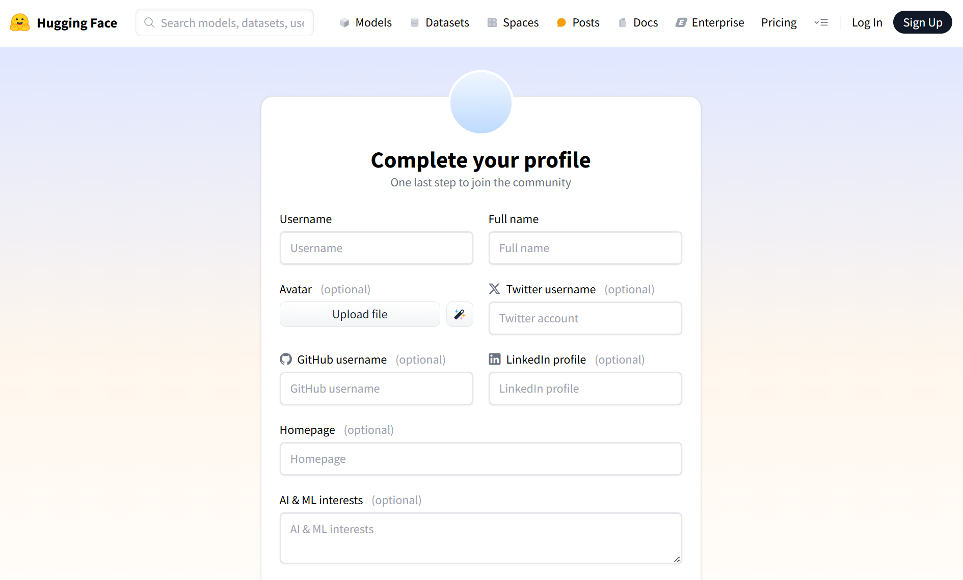 这步是完善个人信息,必须填写 Username(用户名)和 Full name(完整名字),Username 决定了个人 HuggingFace 账号的个人页面地址, Full name 则是在个人页面展示的名字。