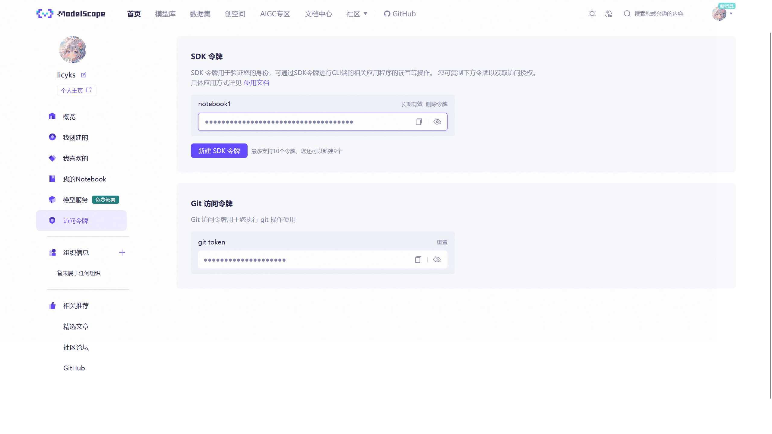 使用 ModelScope CLI 管理个人的仓库需要 ModelScope Token 获取权限,此时回到 ModelScope 官网,点击首页 -> 访问令牌 -> 新建 SDK 令牌,此时将打开 ModelScope Token 创建界面,