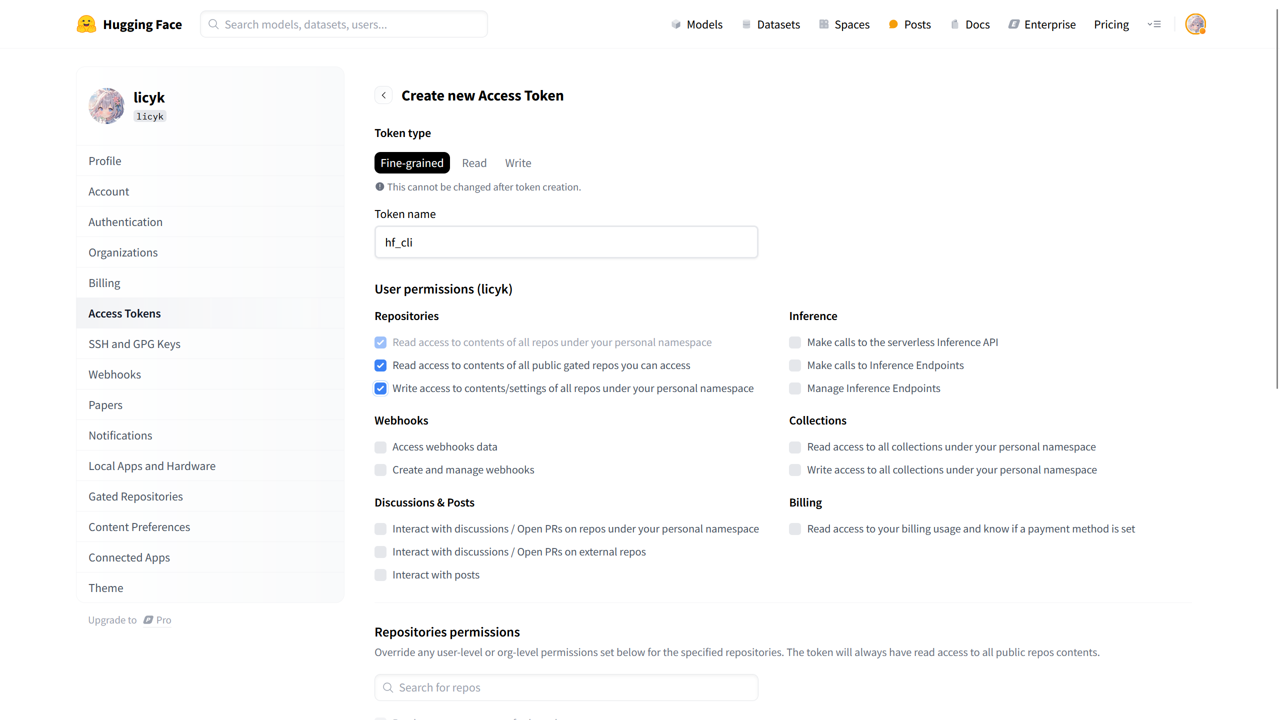 使用 HuggingFace CLI 管理个人的仓库需要 HuggingFace Token 获取权限,此时回到 HuggingFace 官网,点击右上角的头像,选择 Access Tokens -> Create new token,此时将打开 HuggingFace Token 创建界面,