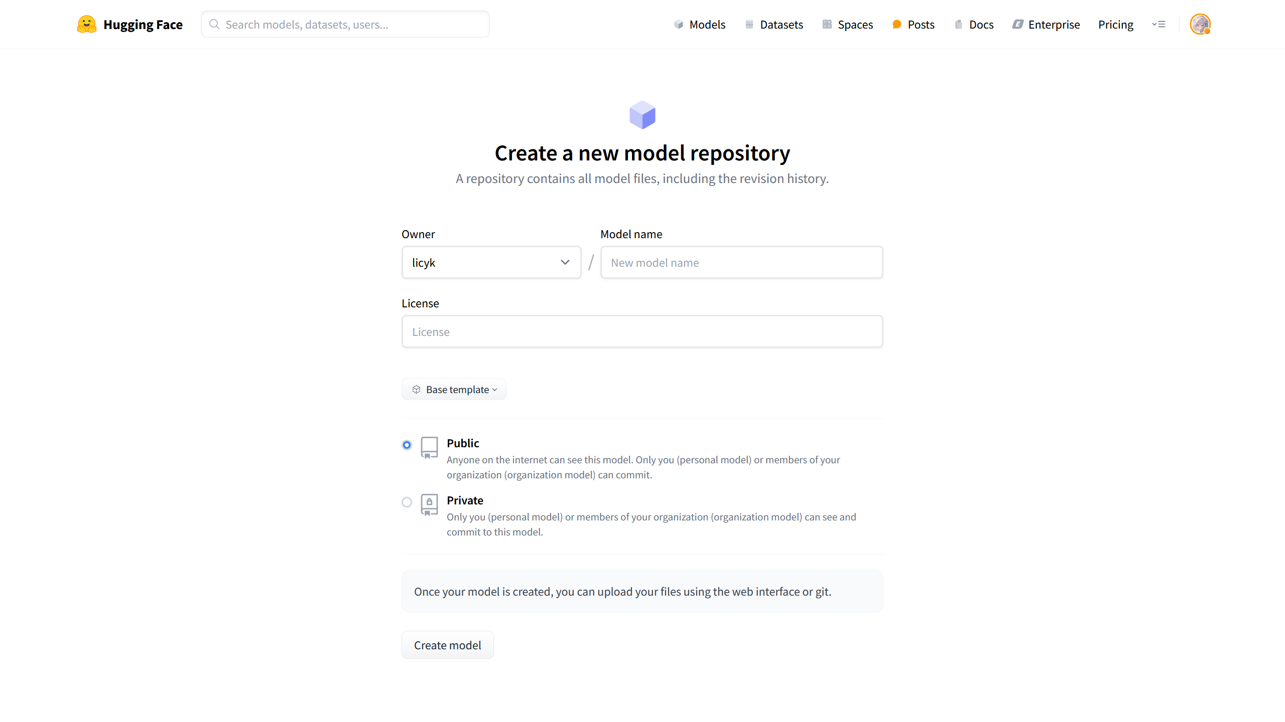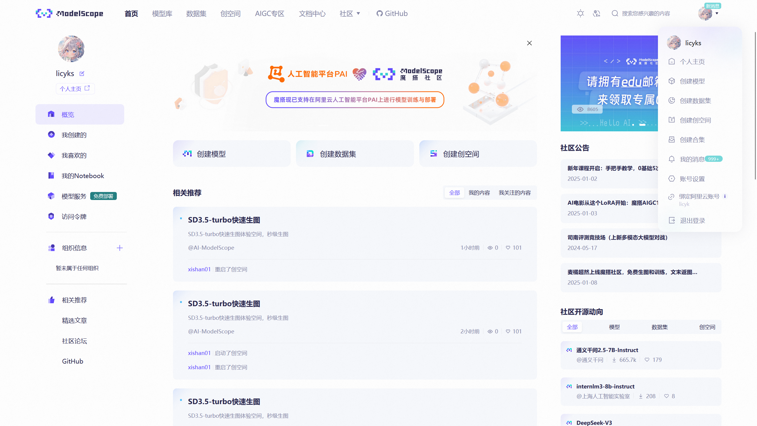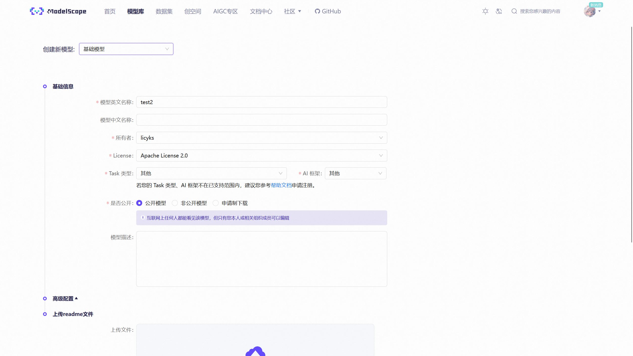 这里可以创建一个模型仓库,点击头像打开菜单,选择创建模型进入模型创建设置页面。