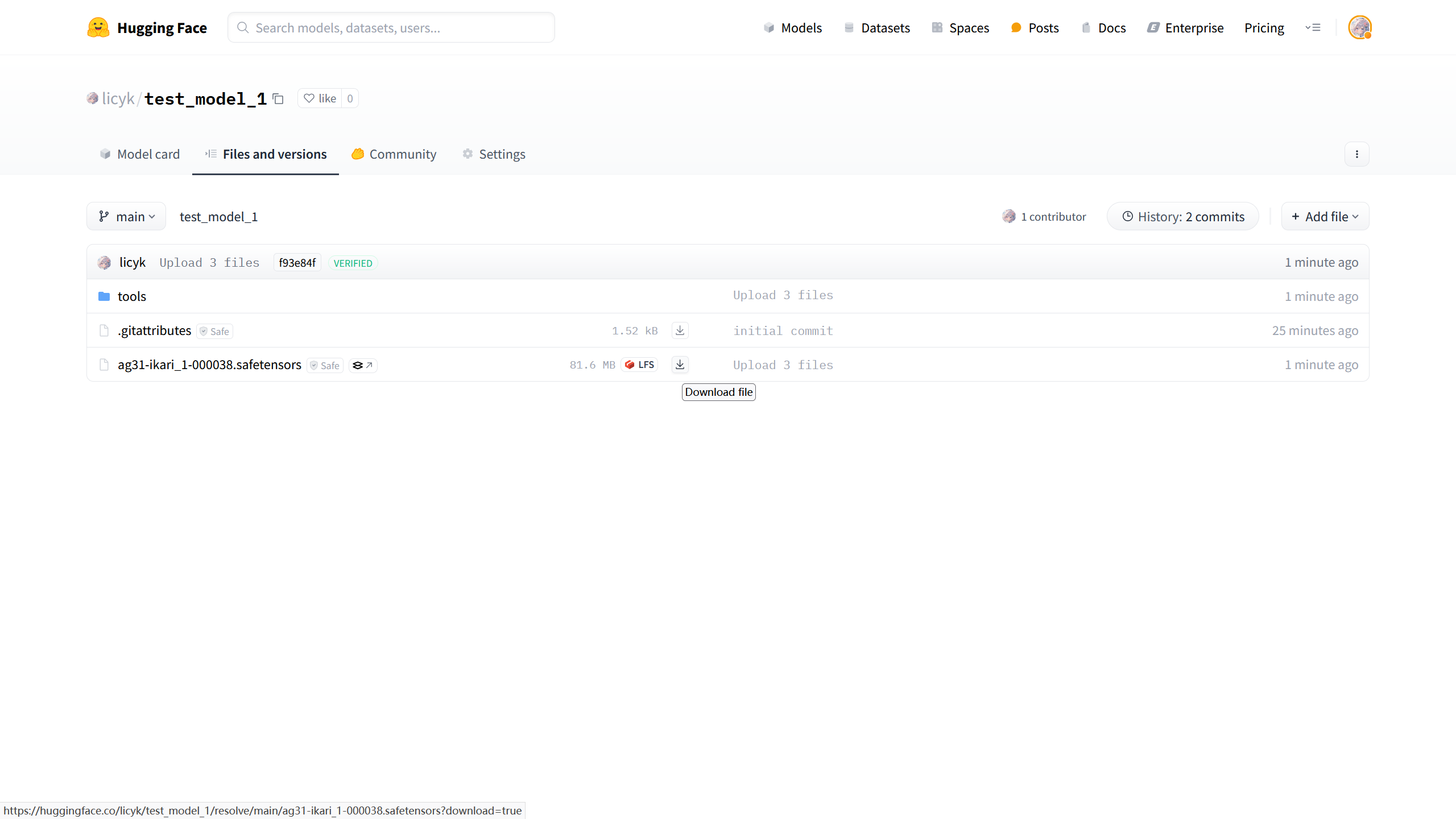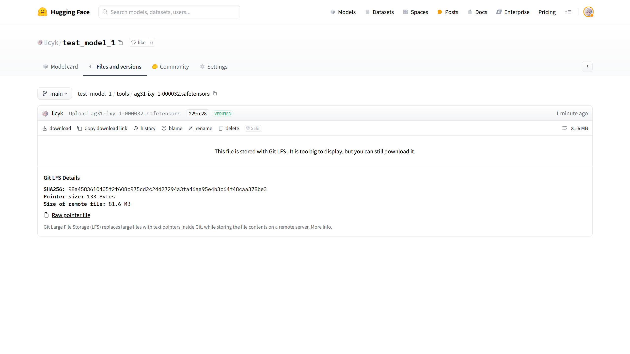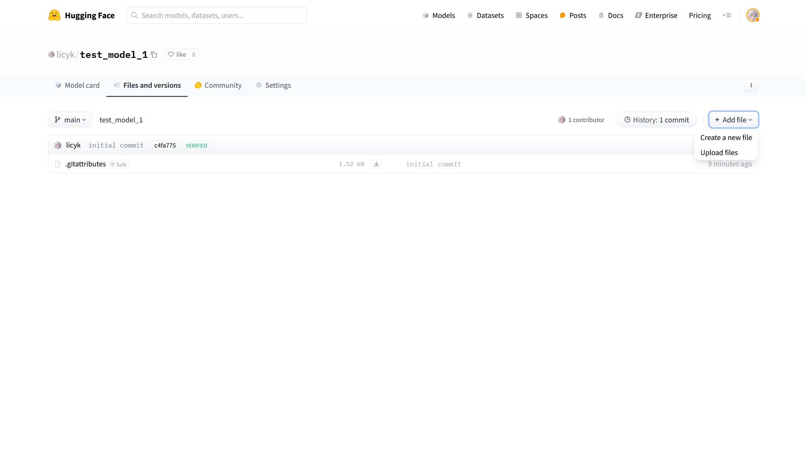 HuggingFace 网页端支持简单的仓库文件管理,这里点击 licyk/test_model_1 进入刚刚创建的模型仓库,在 Files and versions 可以看到仓库中的文件。