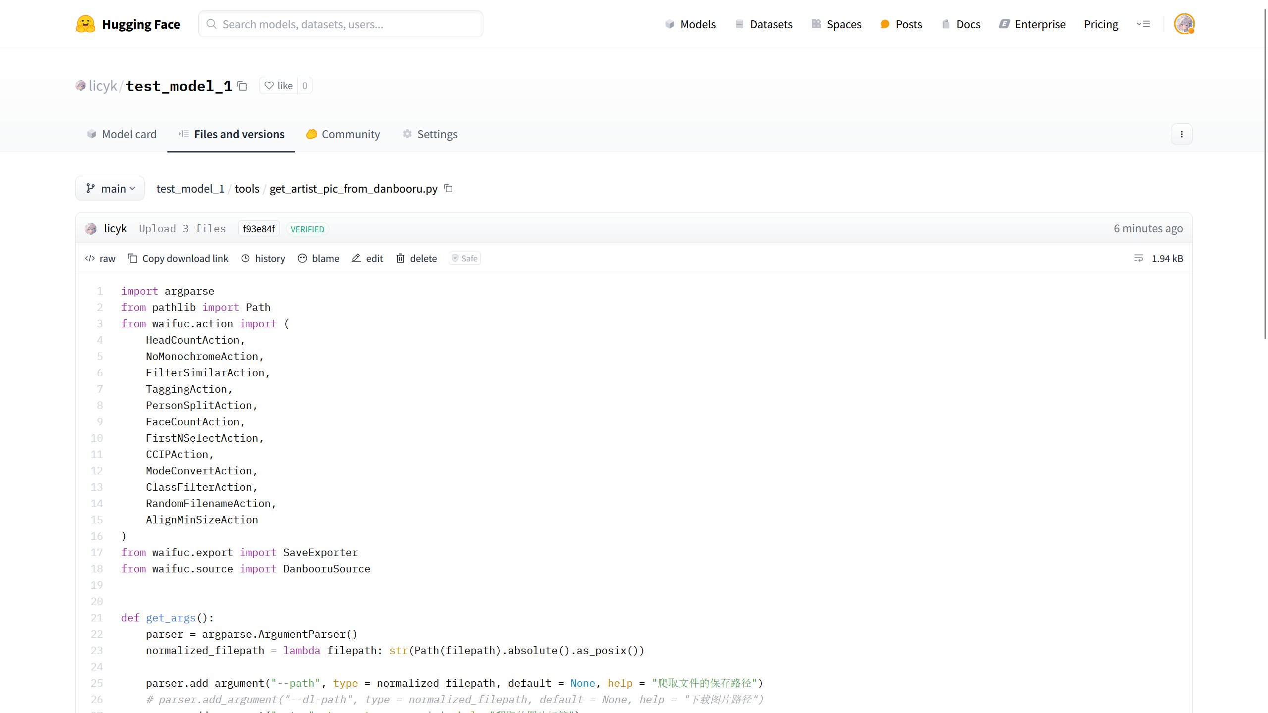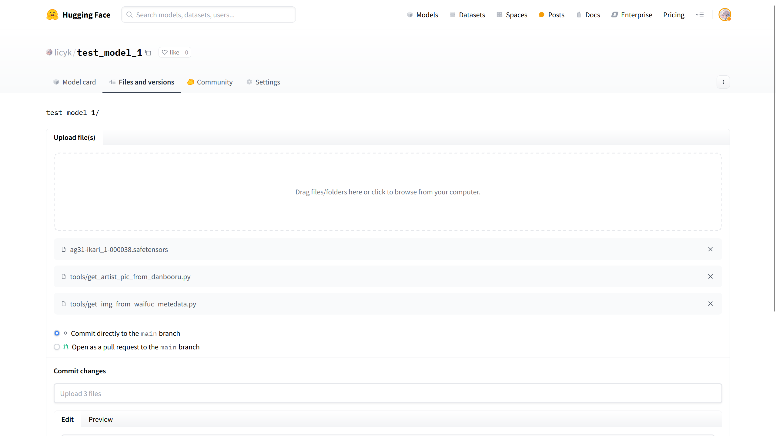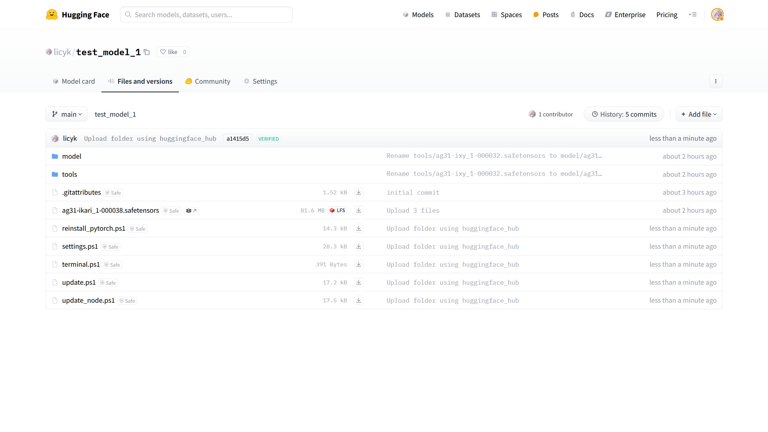 HuggingFace 网页端支持简单的仓库文件管理,这里点击 licyk/test_model_1 进入刚刚创建的模型仓库,在 Files and versions 可以看到仓库中的文件。
