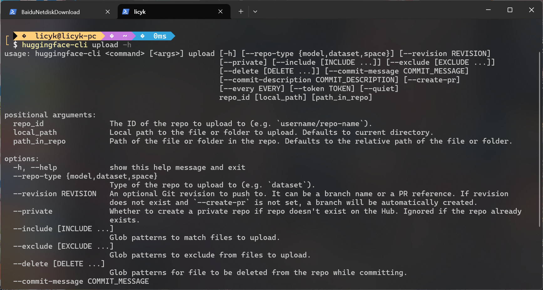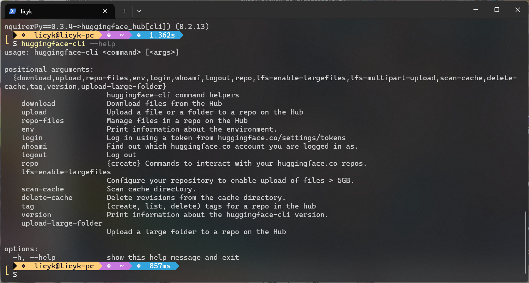安装好后输入下面的命令就可以看到 HuggingFace CLI 可用的命令。