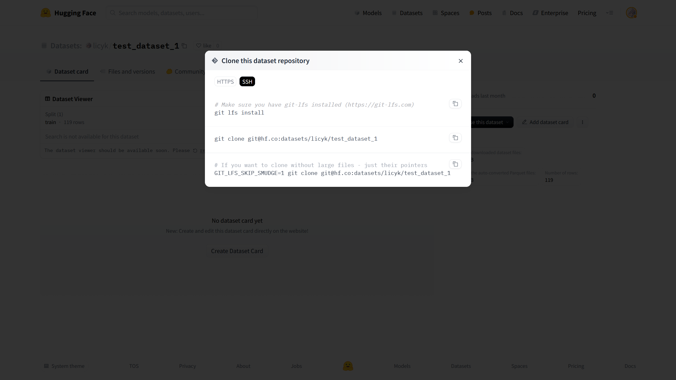 在 HuggingFace 这个页面打开 licyk/test_dataset_1 数据集仓库页面,在右边可以看到三个点的图标,点击后可以看到 Clone Respository(克隆仓库)这个按钮,点击后在上方选择 SSH 就可以看到对应的下载命令。