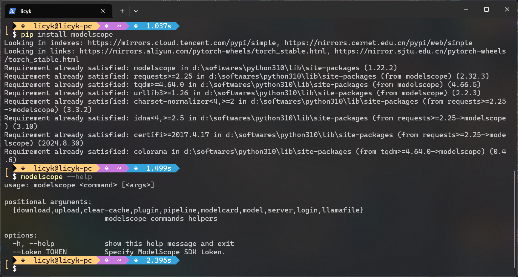 在前面关于 HuggingFace CLI 的介绍中已经安装好了 Python,所以可以直接安装 ModelScope CLI。