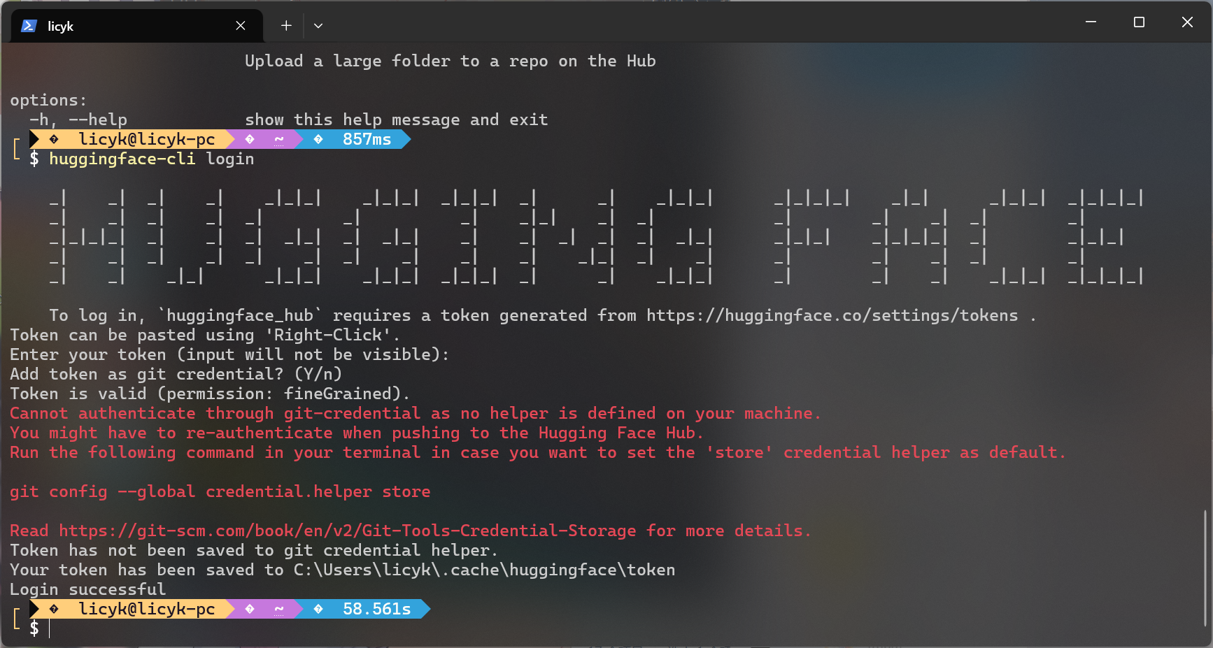 运行时可能会看到红色的错误信息,这无需理会,当最后一行的信息为 Login successful(登陆成功)时则证明使用 HuggingFace CLI 登陆 HuggingFace 账号成功了,接下来就可以使用 HuggingFace CLI 管理自己的仓库文件。