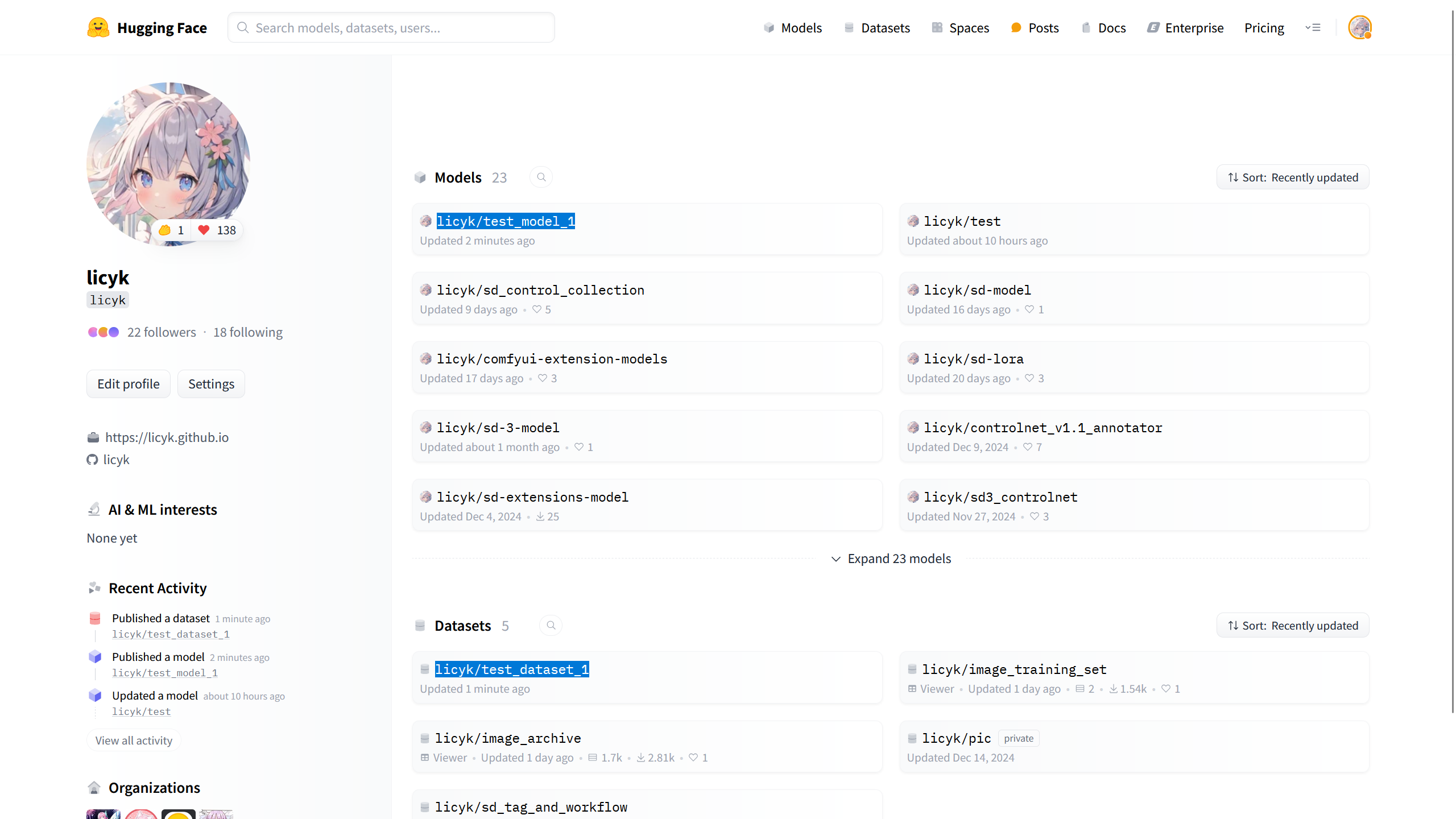 Model(模型)可以看到自己创建的 licyk/test_model_1 模型仓库,Dataset(数据集)可以看到自己创建的 licyk/test_dataset_1 数据集仓库,点击其中某个仓库可以进入仓库详情。