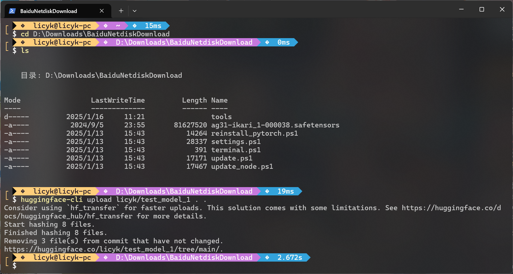 该文件夹中的文件夹内容如下,现在尝试将这个文件夹的内容上传前面创建的 licyk/test_model_1 模型库中,