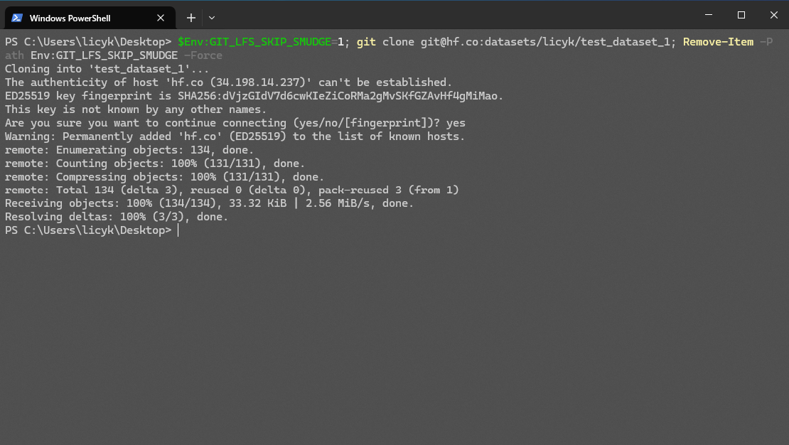 如果显示 welcome to Hugging Face(欢迎使用 HuggingFace)时则说明配置 SSH 密钥成功,现在尝试将 licyk/test_dataset_1 数据集仓库下载下来。
