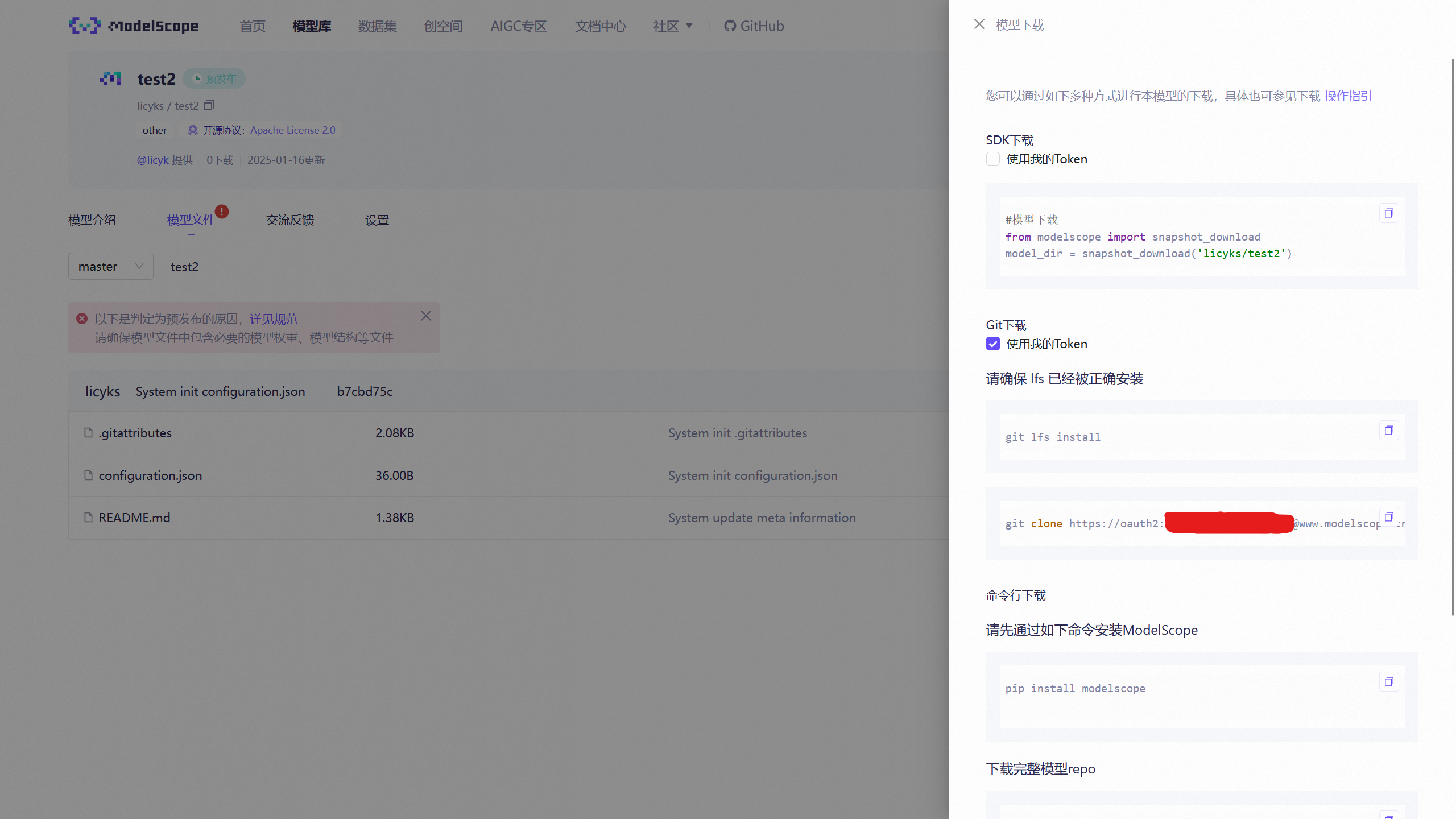 在 ModelScope 的首页 -> 我创建的可以看到刚刚创建的模型仓库,点击进入刚刚创建的仓库,进入后点击模型文件 -> 下载模型,在 Git下载的说明勾选使用我的Token,此时可以按照说明运行命令将仓库下载下来,并且使用之前介绍的方法进行管理。