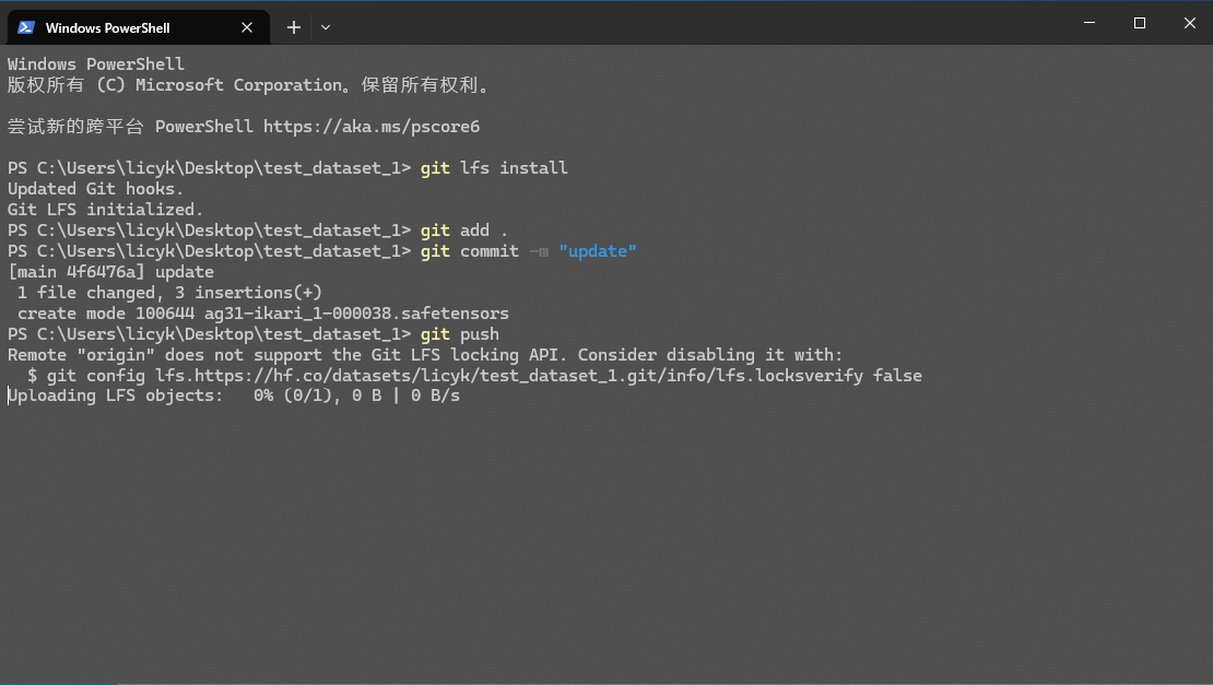 如果需要将仓库的更改同步到 HuggingFace 中,可以在仓库文件夹中打开终端,输入下面的命令同步更改。