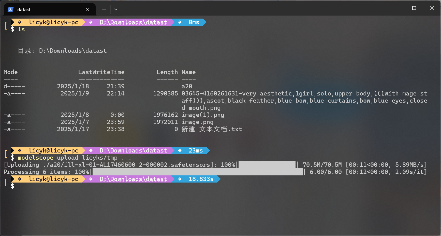 现在要给 licyk/test_dataset_1 这个数据集仓库上传一个文件夹到仓库中,此时的命令就需要使用 –repo-type 参数来指定(只要仓库类型不是模型仓库,而是数据集仓库或者在线运行空间仓库,就需要该参数进行指定,数据集仓库使用 –repo-type=dataset,在线运行空间仓库使用 –repo-type=space)。