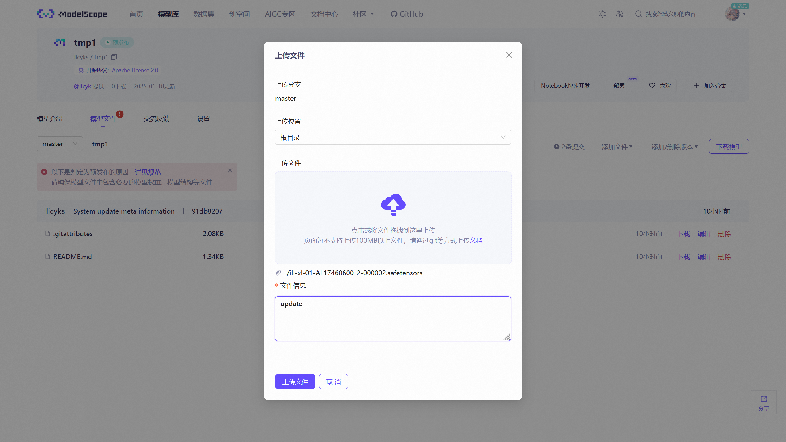 进入仓库后,在模型文件中可以看到仓库中的所有文件,支持下载,编辑和删除,点击添加文件 -> 上传文件可以上传文件,但目前只支持上传单个文件,并且只能大小限制在 100 MB 以内。